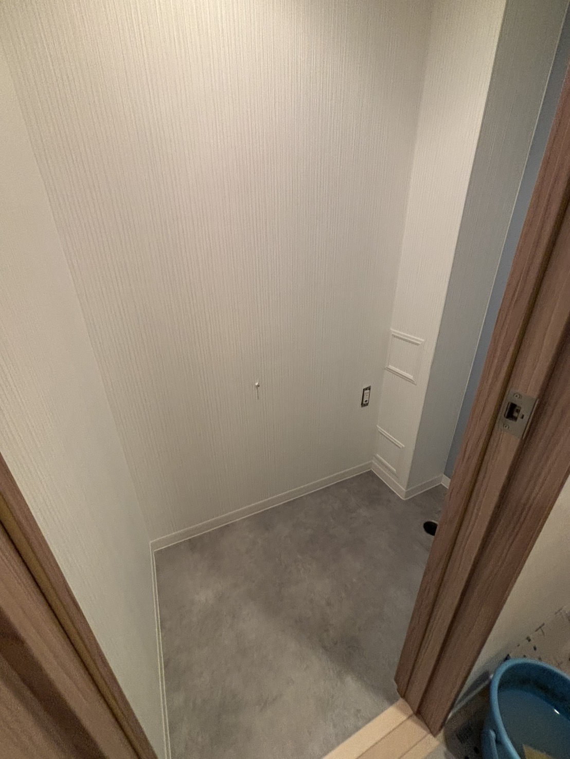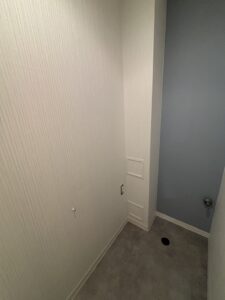アクセントクロスの水色とクッションフロアのグレーがとてもかわいい映える内装でした!